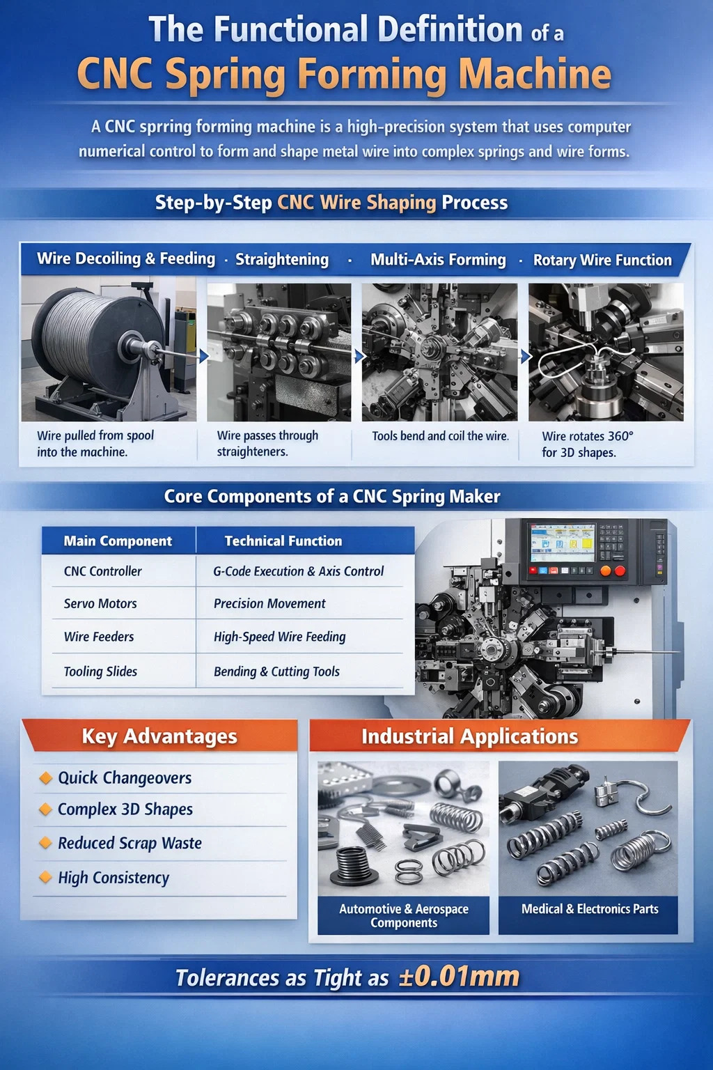 A CNC machina vere formatam summus praecisio est fabricandi systema, quo numerica potestate computatrale utilitas est ad automate flexionem, spiram et ad filum metallicum in geometrias compositas vere et intricatas formas. Secus traditum mechanicum vere fabri, qui certis camshafts innititur, hoc hodierno instrumento utitur multa iuris servo motores varias secures regere, permittens creationem figurarum non normarum quae manually consequi impossibile esset.