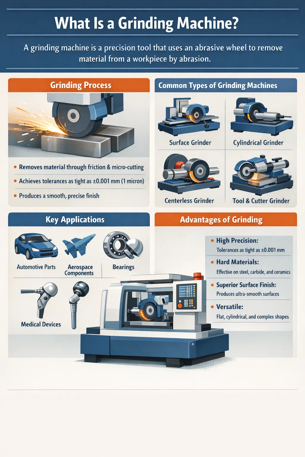 A machina stridor praecisio est vis instrumenti vel machinae industrialis quae utitur rota laesura — vel alia ascia abrasiva — ut materiam ex workpiece per abrasione removeat. Ex quo fit, superficies subtiliter perfecta, dimensio praecisa, vel acumen acutum. In fabricandis, machinarum stridoribus sub specie instrumentorum machinorum collocantur, et munus criticum in operationibus perficiendis ubi tolerantiae tam stricte inserviunt. ±0.000 mm (1 micron) requiruntur.