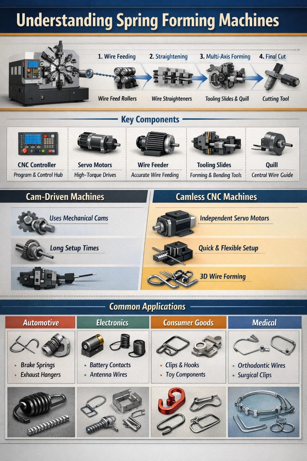 A vere formatam machinam peculiaritas est CNC (Imperium Numerale Numerale) machinalis industrialis destinata est ad flectendum, coil, et figurandum filum metallicum in geometrias compositas 2D vel 3D. Dissimiles machinis coire fundamentalibus quae vexillum cylindricum in primis producunt, fons machinae formans utitur plures independens secures - saepe vndique a 3 ad 12 vel magis - creare intricatas formas filum, torsio fontium et pugnae contactus cum summa subtilitate.