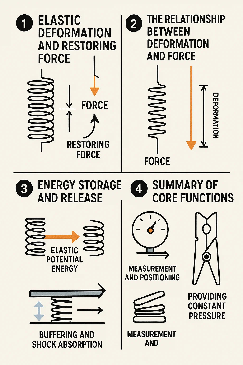 Effusio et concursus offensio: Fontes industriam ab impactibus et vibrationibus hauriunt et gradatim illud tempus dimittere, structuram tuentes (ut systema currus impulsum effusio). Mensuratio et Positiones: In squamis deformatio fontis mensurari pondus potest; in multis mechanicis machinis, post expletum laborem (ut in globulis et permutationibus) partes ad priorem statum redire consuevit.