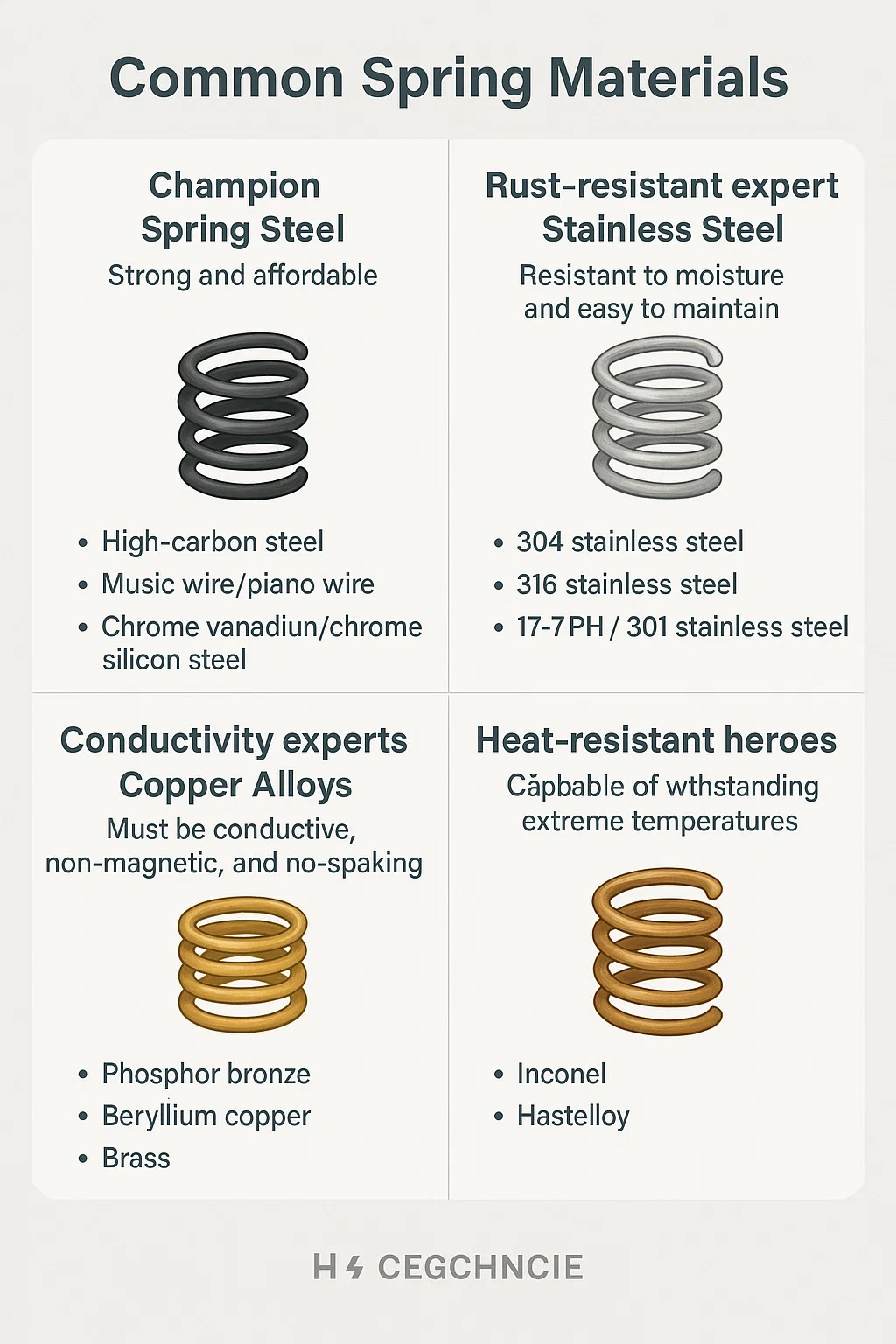 Electio ius metalli fontium pendet ex applicatione requisita - quanta vis resistet? Nunquid rubiginem? Erit opus environment calidum? An opus electricitatis ducere? Notae hic sunt materiae communis;